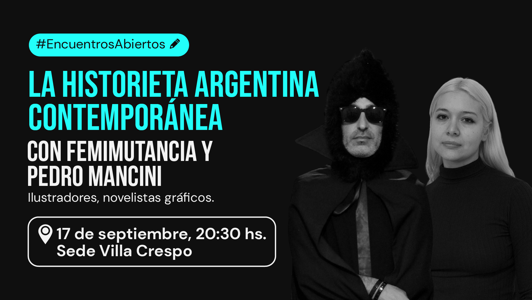 Femimutancia y Pedro Mancini, artistas del comic argentino contemporáneo, visitarán ETER este miércoles 17 de septiembre a las 20.30hs. Conversarán con estudiantes sobre sus procesos creativos, sobre la escena independiente de la historieta argentina, su irrupción en las redes sociales y más.